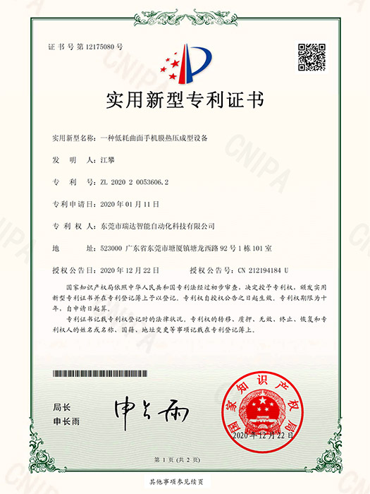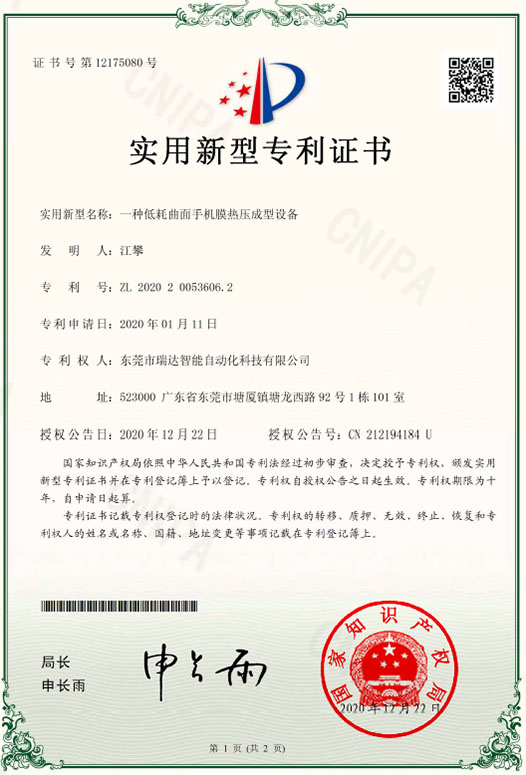 一種低耗曲面手機(jī)膜熱壓成型設(shè)備—實(shí)用新型專利證書